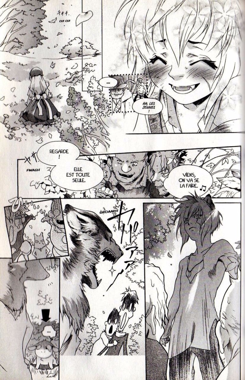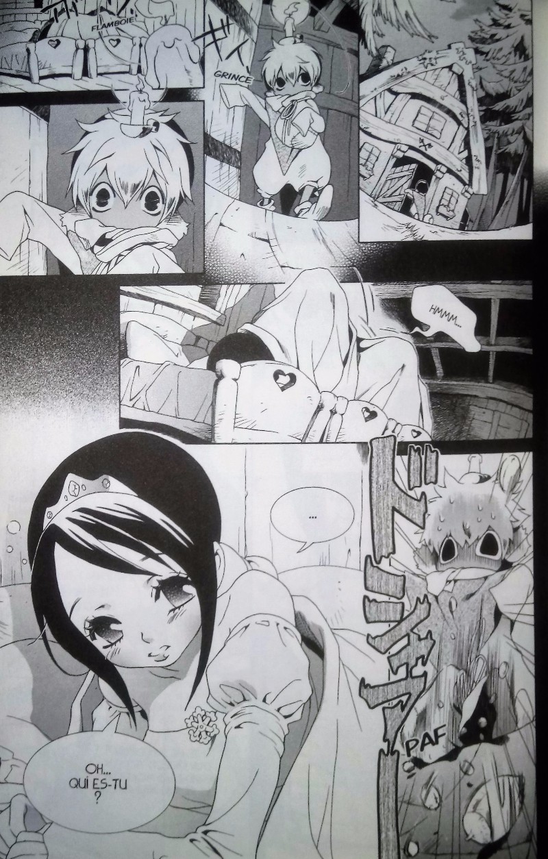 Kei Ishiyama, l’auteure, ne se contente pas d’adapter ces récits mais s’en inspire pour proposer ses propres poésies narratives… et fait preuve d’une imagination pour le moins débordante ! Le loup du Petit Chaperon rouge reçoit ainsi les conseils avisés de chèvres avant de deviser sur l’injustice des hommes et d’aider Mère-Grand à couper du bois. Raiponce, aux cheveux d’or et à la voix d’ange, n’est plus une jeune fille mais un beau jeune homme retenu par une sorcière…