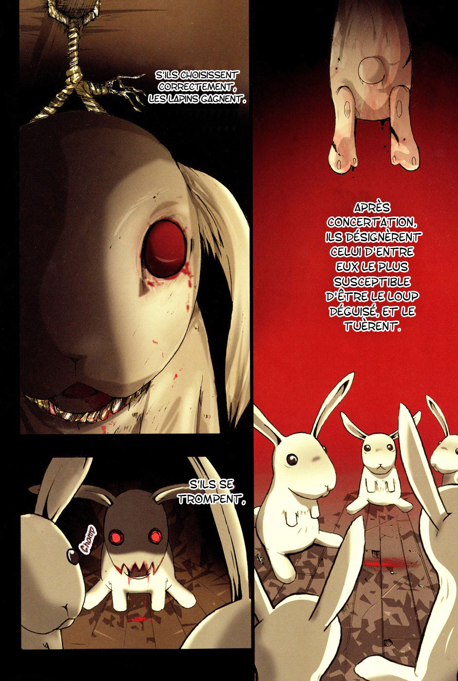 Les lapins, apeurés, pour démasquer le loup, se mirent à exécuter tous ceux qu’ils suspectaient d’être l’animal sauvage. S’ils venaient à se tromper, ils seraient, alors, tous dépecés.