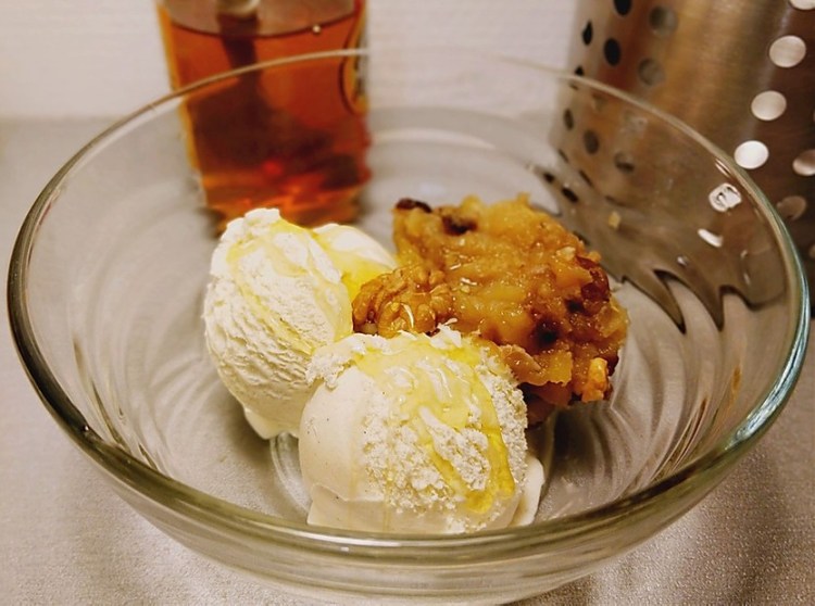 Cependant, le goût est excellent. La bouillie de pommes accompagne merveilleusement bien les boules de glace à la vanille que j’ai dans le congélateur.