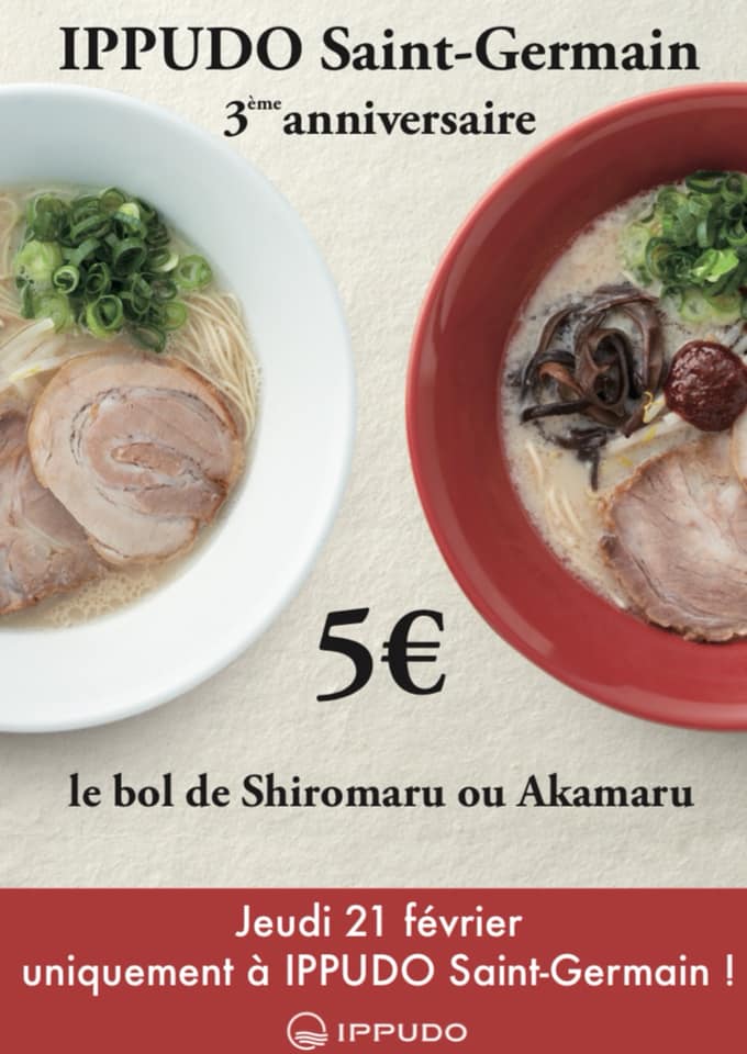 Le 21 février 2019, oui demain, Ippudo St Germain (14 rue Grégoire de Tours Paris 06) fête ses 3 années d’existence. À cette occasion, les bols de Shiromaru et Akamaru seront à 5€ de 12h à 23h. Alors profitez-en ! Ce serait bête de louper cet événement surtout si vous déambulez dans le coin.