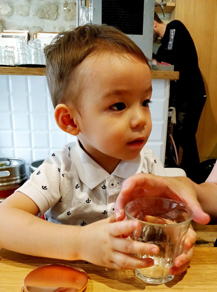 La serveuse qui nous accueille n’est pas forcément très agréable mais on s’en fiche un peu. Il y a un moment d’incompréhension lorsque je lui explique que j’ai un rehausseur portable. Elle m’enlève une chaise pour que je positionne la poussette à la place. Hum non… c’est un peu bas pour que l’enfant puisse grignoter.