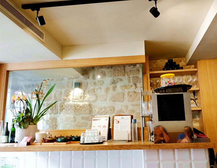 Le cadre est clair et reposant. Du blanc, de la pierre, du bois. On s’y sent bien. La salle bien qu’étroite est en longueur, du coup ce n’est pas étouffant.