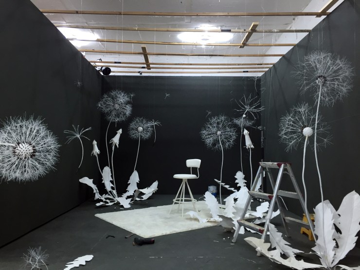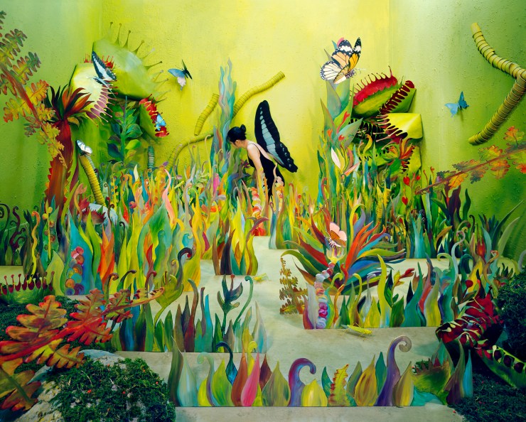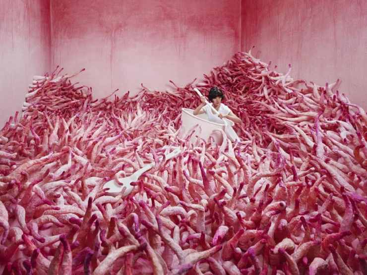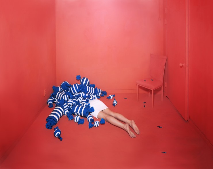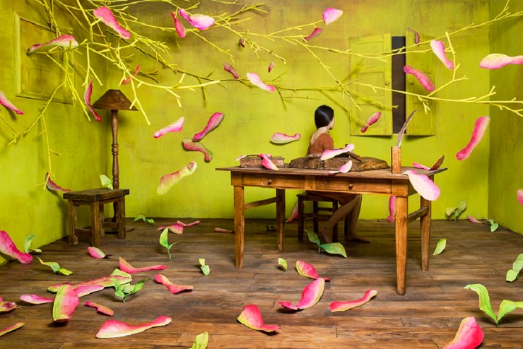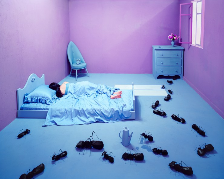 Elle puise en elle pour créer de véritables univers à mi-chemin entre le doux songe de l’enfance et l’oppression du cauchemar. Durant des semaines, voire des mois, elle confectionne le décor de son tableau vivant à venir. Tout est fait de ses mains. Patiemment. Dans son petit studio pas plus grand qu’un mouchoir de poche, elle se met en scène pour un moment onirique suspendu dans le temps.