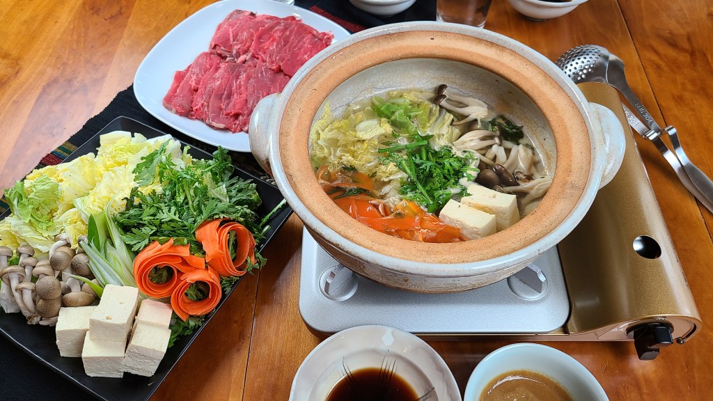 Les ingrédients sont préparés à l’avance permettant ainsi aux hôtes de se détendre et de profiter pleinement de la présence de leurs invités autour d’un repas très convivial car que l’on utilise le récipient traditionnel de base à savoir une marmite (nabe) en terre cuite, ou simplement une grande casserole posée sur un réchaud ou un appareil électrique, ce repas est directement cuisiné au milieu de la table.