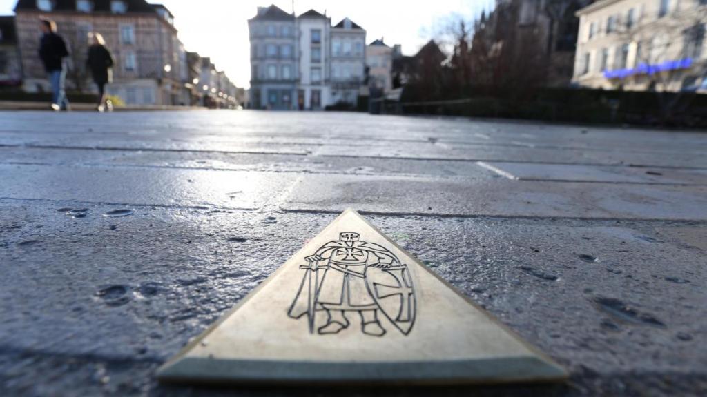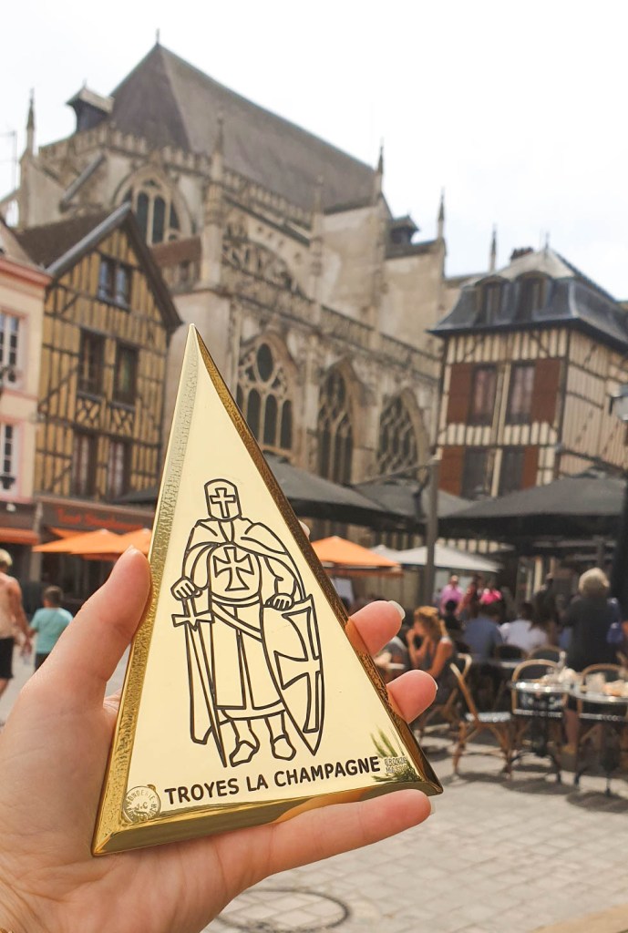 En marchant, tu remarques vite des petits triangles dorés incrustés dans le sol à Troyes avec un chevalier et une flèche. Tu les as suivis sans t’en rendre compte. Saches que c’est le chemin des chevaliers, un parcours piéton balisé qui t’emmène à travers la vieille ville.